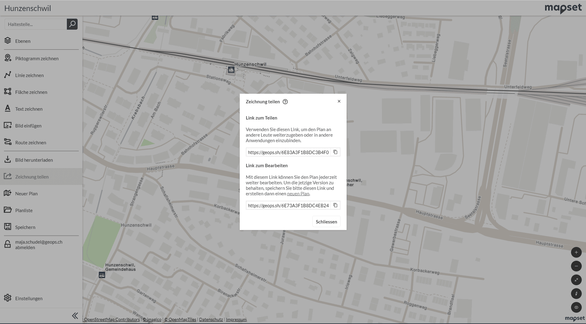 Unter dem Teilen-Button erhalten Sie zwei unterschiedliche Links. Der «Link zum Teilen» erlaubt die dynamische Anzeige des Plans auf Websites oder in Social Media-Kanälen. Mit dem «Link zum Bearbeiten» können Pläne gemeinsam im Team bearbeitet werden.